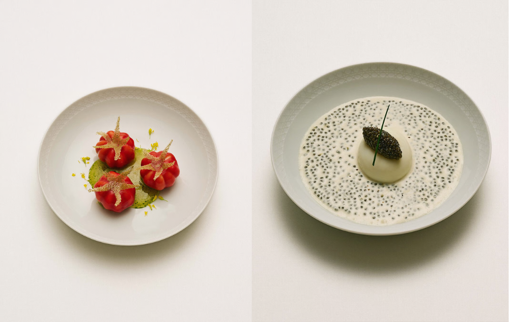 Alléno ha concebido un menú que se lee como una colección de moda: platos que combinan precisión técnica, belleza visual y sensibilidad artística. Inspirado en los jardines de Christian Dior y su amor por la naturaleza, el chef propone creaciones que evocan flores, telas y perfumes.