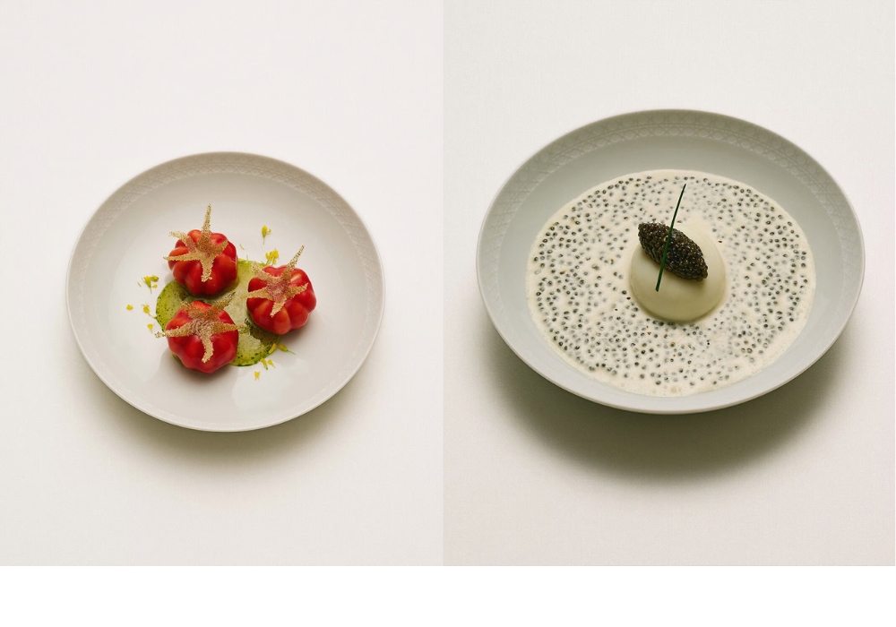 Alléno ha concebido un menú que se lee como una colección de moda: platos que combinan precisión técnica, belleza visual y sensibilidad artística. Inspirado en los jardines de Christian Dior y su amor por la naturaleza, el chef propone creaciones que evocan flores, telas y perfumes.